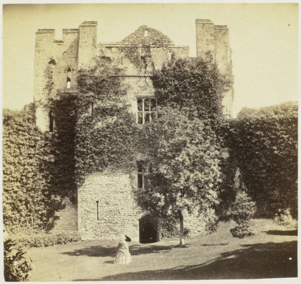 Curator: There's an undeniable atmosphere of melancholic grandeur here. What do you make of it? Editor: That’s the immediate pull—the sublime decay! The way the vegetation aggressively colonizes the stonework... Holden seems less interested in capturing architectural details and more interested in visualizing ruin. Curator: This is J. Holden’s “Old Gateway, Raglan Castle, Monmouthshire,” taken in 1855. Raglan Castle has a layered history, a symbol of power shifts over centuries, and eventually met its partial ruin during the English Civil War. Editor: I see that visually in the stark contrast between the geometrical form of the archway versus the chaotic textures produced by the vegetation, this interplay emphasizes fragmentation, absence... the dominance of nature over human constructs. Curator: Yes, precisely. Castles were already powerful symbols, standing for protection and social hierarchy. To see one in such disrepair signifies loss of authority and perhaps societal collapse, the gateway no longer serves its function, now inviting you to what? Editor: Now, to a ghostly echo of history. The cool tonality in the photograph, achieved through a wet collodion process I assume, intensifies this feeling of removal, of seeing something already distant. There’s also a figure almost hidden in the gateway, and, depending on the interpretation, we could add more complexity, maybe something regarding perspective, which also adds meaning to this particular print. Curator: Spot on. That hidden presence hints at a continuation of human story. Despite ruin, people persist. I feel Holden might have sought to capture not just loss but a transformation and continuum, a meditation of sorts on the ebb and flow between civilization and nature. Editor: Ultimately, the power of this image resides in that duality. Formally it creates tension, but emotionally, it triggers something deeper. This visual exercise on permanence and decay really hit something different within me. Curator: An evocative reflection, indeed, on how memory itself persists within crumbling facades.