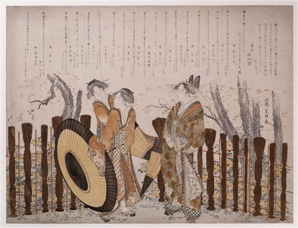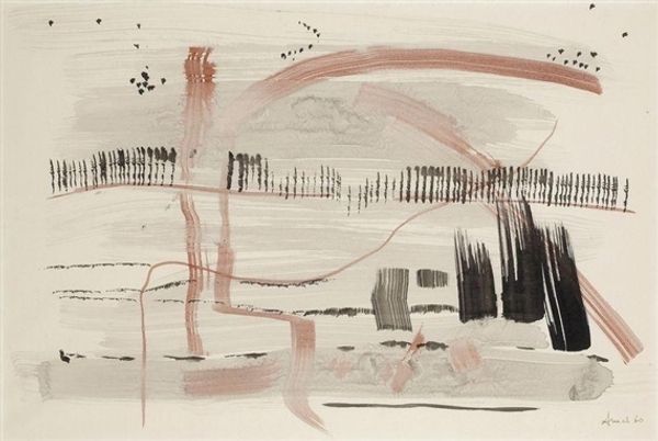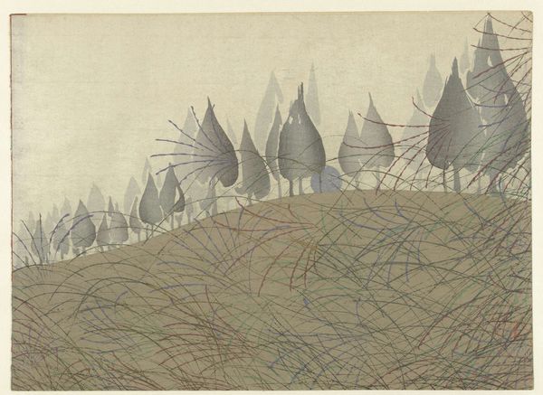 Editor: We're looking at Kamisaka Sekka's "Autumn Night," made between 1909 and 1910 using ink and coloured pencil. I find the monochromatic scheme and minimalist style give it a sense of tranquility, but there's something unsettling too. What do you see in this piece? Curator: The "unsettling" feeling you describe may stem from the social anxieties present during the Meiji period in Japan. Artists like Sekka grappled with rapid modernization and Westernization. Look at how he uses traditional Japanese art techniques – ink drawing, for example – to depict a scene that feels both familiar and strangely distant. Do you notice how the house almost seems to be hiding or fading? Editor: Yes, the house blends into the background. Is that deliberate, maybe symbolizing the disappearance of traditional ways of life? Curator: Precisely. The Meiji government actively promoted Western art and architecture. By using traditional forms to portray this lonely scene, Sekka might be subtly critiquing the cultural shifts, perhaps highlighting a growing sense of loss and cultural identity within a transforming Japanese society. It almost makes one think if his aim was to depict a serene setting or actually make a critical comment. Editor: That’s a powerful interpretation. I hadn't considered how social pressures of the time could influence the visual choices in such a quiet scene. Curator: Consider also how exhibitions during this period played a crucial role in shaping public perception of art. "Autumn Night," presented within that context, gains another layer of meaning. What do you make of the moon in relation to that idea? Editor: It almost looks like it is eclipsing the home. Thanks, I'll definitely look closer at the history of this artwork! Curator: Absolutely, thinking about cultural context is a helpful practice that allows one to see deeper in many artworks!