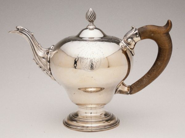 Curator: This striking object, a Sugar Bowl made of silver, dates to somewhere between 1835 and 1840. It can be found here at the Metropolitan Museum. The creator’s mark identifies William Forbes. Editor: It's wonderfully opulent. My immediate feeling is the sheer weight of its design seems to embody the power dynamics embedded in sugar production itself. The scale and luster hint at the exploitation that fueled such displays of wealth. Curator: Yes, there’s an interesting visual dialogue happening here. The overall shape is rigidly geometric—the strong lines and the clear symmetry speaks to Neoclassical ideals of order and reason. Yet the engraved decoration hints at a more romantic sensibility. Do you think that the “EJC” monogram suggests any deeper meaning? Editor: Absolutely. The presence of initials indicates ownership, inscribing an individual's identity and privilege directly onto the object. It represents not only personal wealth but also highlights the societal structures that enabled it, obscuring a deeper history linked to sugar and enslavement. We can’t forget that sugar fuelled global trade imbalances. Curator: We also see visual cues to status, like its complex engraving patterns which are symbols that echo throughout art history, often signifying abundance or family crests that act as subtle, recognizable codes of belonging. Do you agree that they amplify its social meaning? Editor: Agreed. Each curve, flourish, and carefully placed initial solidifies the narrative of power. While appearing to represent elegance, it simultaneously symbolizes the brutal underpinnings of economic structures that benefited a select few. It would be interesting to view this with other artefacts to fully visualise that narrative. Curator: Reflecting on this "Sugar Bowl," its symbols serve as silent reminders of a complex cultural past. Editor: Exactly. Hopefully its visibility might spur dialogues about the historical relationships between luxury and exploitation.