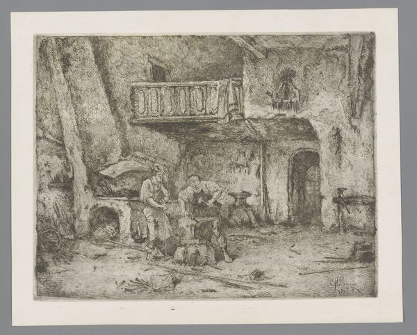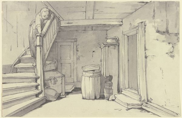 Maria Vos's watercolor drawing presents us with the interior of an old bakery, dominated by the oven itself—a symbol of transformation and nourishment. The dark, cavernous mouth of the oven evokes the ancient motif of the underworld or the womb, a space of both creation and potential destruction. Notice the scales positioned on the left, an emblem of justice and balance since antiquity, frequently seen in depictions of divine judgment. The scales remind us of how the process of baking, like life itself, is governed by precise measures and equilibrium. Consider how fire, the heart of the oven, has been a sacred element across cultures, representing purification, energy, and domesticity. Think of the hearth goddess Hestia in ancient Greece, the eternal flame tended with reverence. The oven, then, becomes not just a tool, but a locus of deep cultural memory, resonating with our primal connection to sustenance, warmth, and the cyclical nature of life.