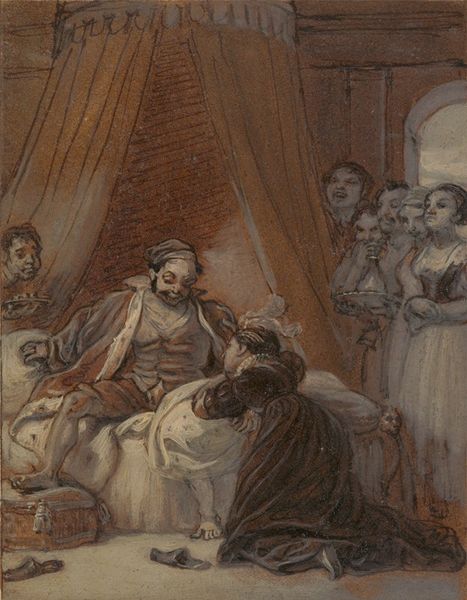 Curator: This compelling oil on canvas is titled "Death of Elizabeth I, Queen of England" by Paul Delaroche, created in 1828. It currently resides here in the Louvre. Editor: My first impression is one of stark drama. The high contrast between the brightly lit deathbed and the surrounding darkness really focuses my attention. Curator: Absolutely. Delaroche captures the historical weight and political significance of Elizabeth's passing. Notice the women in waiting, their emotional display reflecting societal constraints on female expression in mourning versus the men standing stoically behind them. Consider too that this painting emerged during a period of renewed interest in Romanticized historical narrative. Editor: Indeed, the composition guides our eye from the opulent fabrics of her gown to the concerned faces gathered around. I am intrigued by how the artist uses diagonal lines created by the bodies and gaze of figures to express a kind of chaotic tension while remaining ordered and stable. How would you describe the use of colour here? Curator: The crimson reds of the royal clothing is so significant, not merely for richness, but as potent symbol of authority and bloodlines amidst succession anxieties that underscored Elizabeth’s legacy and her reign. As a powerful female leader in a male-dominated world, Elizabeth's identity was constantly under scrutiny and fiercely debated. The colours are reflective of the anxieties that existed at the time around the queen. Editor: You can certainly discern a meticulous observation of textures here - from the furs and silks to the smooth pallor of Elizabeth’s face, contributing to the realism characteristic of its time, yet amplified with dramatic lighting. Curator: Precisely, reflecting how even something like an oil painting can reflect the dynamics of power, identity, and grief within a specific moment. Editor: It offers a compelling example of how the formal aspects of painting underscore and contribute to wider historical contexts. Curator: It is certainly a testament to the artist's ability to make tangible a historical shift and a compelling moment of mortality.