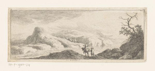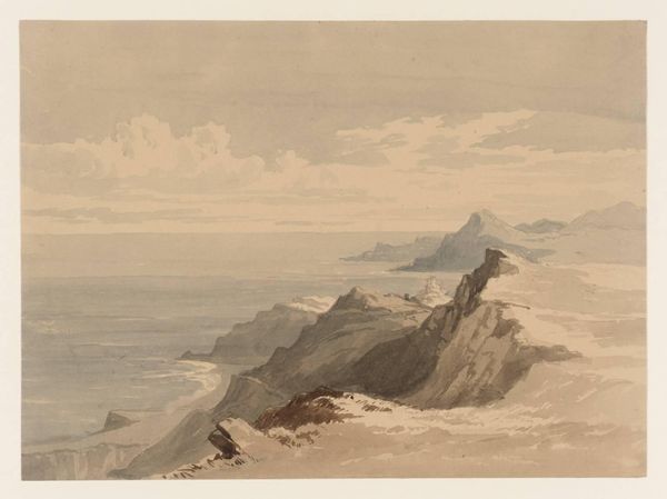 Curator: This drawing, housed at the Rijksmuseum, is titled "Figuren op een pad langs een rotskust," or "Figures on a Path Along a Rocky Coast," created by Petrus Johannes Schotel sometime between 1841 and 1865. Schotel employed pencil, charcoal, and watercolor in its making. Editor: My first impression is of quiet resilience. The misty, muted tones evoke a kind of subdued determination as figures move along this daunting precipice. Curator: Indeed. There’s a delicate balance between the vulnerability of the tiny figures and the imposing mass of the landscape. Consider the Romantic era's emphasis on the sublimity of nature—nature's ability to inspire awe, even fear. That sheer cliff face looming behind the path amplifies this effect. Editor: I agree, and I wonder about the implications of placing people—presumably ordinary people—within that sublime context. It speaks to humanity’s relationship with its environment, especially if these walkers were marginalized in some way. Are they seeking refuge, perhaps? Or forging a new path against seemingly insurmountable odds? Curator: It’s certainly open to interpretation. But observe how Schotel utilizes very faint lines of pencil sketch underneath and charcoal drawing. He almost erases the human presence with the subtlety of the rendering, suggesting their lives might be but a transient blip in geological time, dwarfed by something with greater importance. Editor: That might actually speak more to the class structures of the period, though. Was the artist thinking about which lives, which stories, get centered or disappear? Consider how gendered assumptions or racist presumptions of who is even capable of claiming ownership of space might make certain people seem faded in historical records. The mist may well erase the memory of some stories and emphasize the prominence of others. Curator: Perhaps. Art has power over time and, therefore, memory. Though whether such sociopolitical commentaries were the primary objective of Schotel in his artistry remains speculative, the visual language gives power to his Romantic landscape as well. The figures can certainly symbolize resistance against the overpowering dimensions of time and landscape. Editor: Precisely, the piece encourages us to question who and what we memorialize and to recognize the strength required to traverse paths made precarious by systemic injustice. It is beautiful because of how open the artist was able to allow an inclusive understanding, with more questions than answers for each viewer, regarding an awareness for that memory over time.