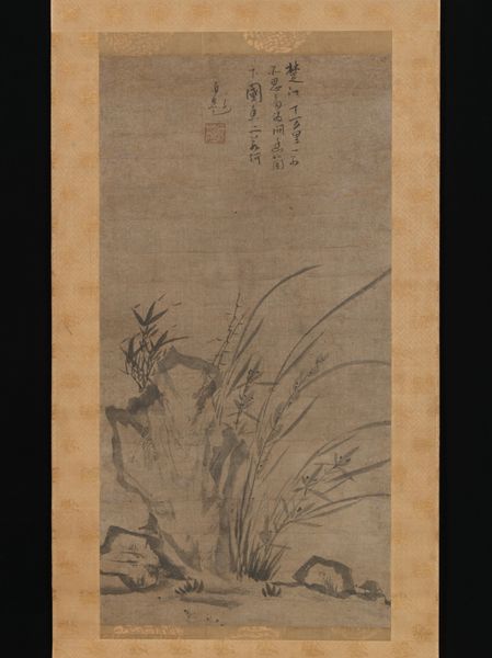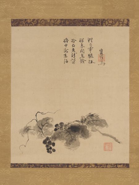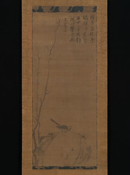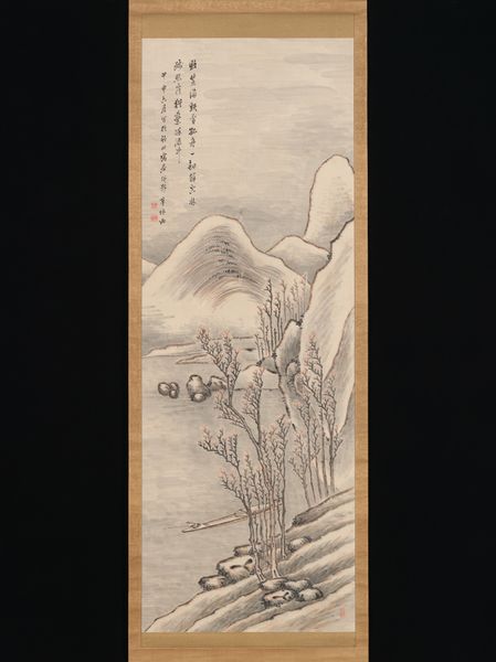 Curator: Minagawa Kien’s “Plum Blossoms,” created sometime between 1734 and 1807, graces the walls of the Metropolitan Museum of Art. Its rendering is delicate, I must say. Editor: The ethereal quality of the neutral brown palette against the aged paper creates a sense of nostalgia, like gazing into a memory. Curator: The composition intrigues me. Notice how the artist meticulously built the form of the plum tree. It seems as if it's on the brink of blossoming forth from the top section, only to recede, revealing bare branches toward the tree's base. What do you see in the iconic nature of the flower? Editor: The plum blossom in East Asian art symbolizes perseverance, hope, and beauty in the face of adversity, blooming vibrantly even in harsh winter conditions. The calligraphic inscriptions contribute to the work's symbolism, too. Curator: Absolutely. Note the linear precision, the calculated variations in thickness and pressure. This lends it both aesthetic grace and textual weight. Editor: In a broader sense, its presence, the blossom, signals not just the end of winter, but renewal. These images remind us of cultural continuity. And just as plum blossoms stubbornly brave the elements, so too has human culture adapted through changing times. Curator: True. Consider, too, the delicate ink washes. The subtle gradations create an atmospheric effect. One appreciates not just the depiction but also the technique that evokes this sense of impermanence and reflection. The medium complements the subject entirely. Editor: The work prompts reflections about mortality, beauty, resilience... such poignant reminders embedded in simple objects from nature. Curator: Yes, it is a stunning exploration of artistic representation through minimalist techniques. Editor: And yet a powerful symbol, offering insight and a sense of timeless human connection.