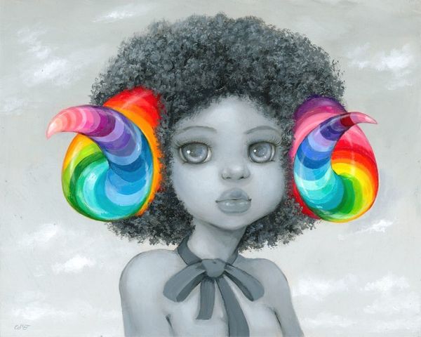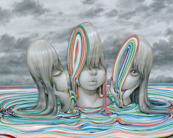 Camilla d’Errico made this painting, interna, using a limited grayscale mixed with a brilliant cascade of rainbow hues. The surface is smooth, almost like porcelain, yet the application of paint reveals a meticulous process. Notice the figure behind the girl, the almost ghostly presence delineated in vibrant color. It's as if a hidden self, or a secret world, is trying to break through. The lines are clean, definitive; the rainbow emerges as a symbol of the inner self, a stark contrast to the muted tones of the girl and the world around her. The controlled palette reminds me of Elizabeth Peyton, in the way it captures a delicate balance between melancholic introspection and a kind of idealized beauty, or maybe Yoshitomo Nara's explorations of childhood innocence and angst. It is a balance between darkness and light, the visible and the unseen.
