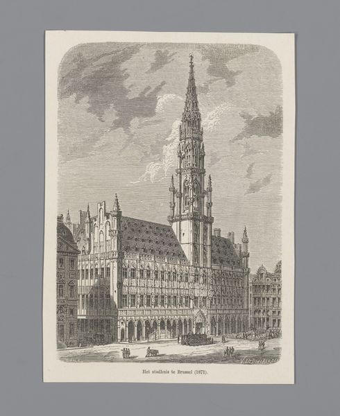 Editor: Here we have A. Dupré's "Stadhuis in Compiègne," an albumen print dating between 1870 and 1890. I'm struck by the almost sepia-toned quality, lending the structure a tangible weight and historical depth. What elements stand out to you in terms of its formal qualities? Curator: The orthogonal lines are paramount to the building’s visual organization, lending to the impression of steadfast stability. This is emphasized through symmetry and a strong sense of hierarchical organization: ground floor, central tiers, steeple, etc. Editor: How does the artist achieve balance within such a rigid structure? It's quite elaborate, after all. Curator: It is elaborate, yet balanced. The photographer juxtaposes detailed ornamentation in the building's facade with larger blocks. Note the subtle play of light and shadow – it softens the angularity, particularly around the window recesses and the detailed stonework of the central tower. It prevents the building from seeming harsh or overly geometric. Editor: So the surface textures play as much a part as the linear aspects? Curator: Precisely. Observe the variation in tones; the greyscale shifts act to articulate distinct architectural forms within the building’s surface. A structuralist might point out how this encodes deeper social hierarchies through symbolic elevation. The top tier, with its ornate tower, is visually "superior" by virtue of its elevated complexity. Editor: That's a compelling interpretation. I hadn't considered the hierarchical reading of the composition. Curator: Considering the structural elements of photography directs one's gaze toward the meaning inherent in the photographer's compositional decisions. Editor: Thanks, that's given me a lot to consider regarding photographic language.