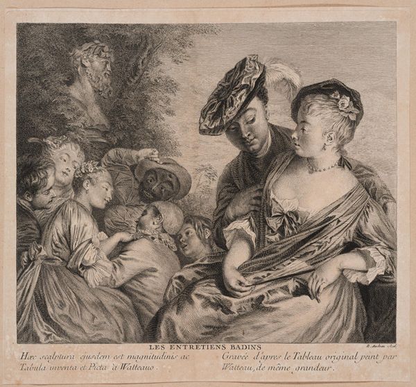 Gerard Sibelius created this etching, “Man met een viool in slecht gezelschap”, sometime in the late 18th century. The artwork presents a snapshot of Dutch social life during the Enlightenment, a time of evolving societal norms and values. The print depicts a man surrounded by two women in what appears to be a moment of revelry. The narrative suggests a cautionary tale about the dangers of succumbing to vice and the pitfalls of lower-class company. This reading aligns with prevailing societal attitudes towards morality and social class distinctions of the period. The "bad company" might reflect anxieties about social mobility and the blurring of class lines, as the era saw the rise of a merchant class challenging the old aristocracy. Sibelius's etching also hints at gendered expectations, framing the women as potential corrupting influences. The print invites us to reflect on how societal norms influence personal interactions, and how these interactions, in turn, shape the broader culture.