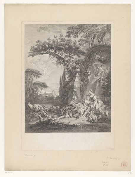 Here we see Christian Wilhelm Ernst Dietrich's etching, "Rocky Landscape with Two Figures Resting on a Stone," held in the Rijksmuseum collection. The print's composition is immediately striking, dominated by the imposing rock formation centrally positioned and looming over the figures. The contrast between the detailed rendering of the rocks and the more broadly sketched background creates a tension, a sense of confinement within the natural world. This is further emphasized by Dietrich's manipulation of light and shadow, which not only adds depth but also seems to dramatize the rugged texture of the landscape. The figures, rendered with classical overtones, appear almost secondary, subsumed by the surrounding geological forms. Does this treatment propose a commentary on the relationship between humanity and nature? Perhaps Dietrich is suggesting a world where nature's grandeur dwarfs human concerns. This dynamic interplay between detail and breadth, figure and ground, invites us to consider how Dietrich uses form to evoke a deeper meditation on our place within the natural order.