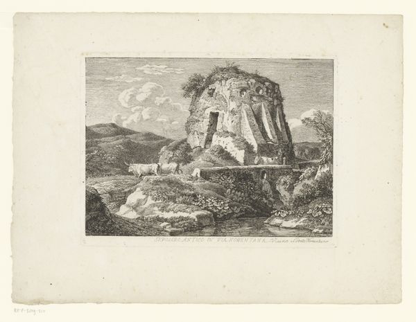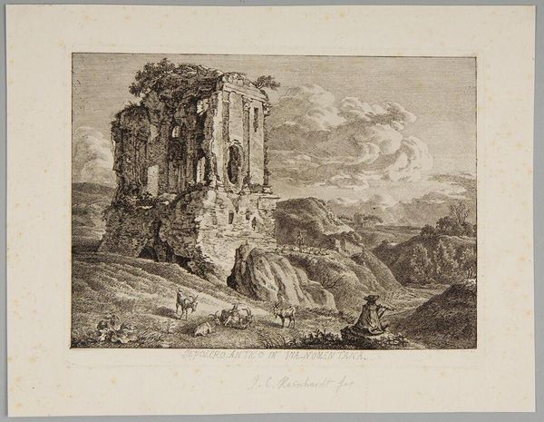 Curator: Reinhart’s “Antieke graftombe aan de Via Nomentana,” created in 1792, presents us with an intriguing scene. Crafted with etching and engraving on paper, this print exemplifies a landscape rendered in a distinctive Romantic style. Editor: My first impression is one of quiet melancholy. The decaying tomb juxtaposed against the serene landscape evokes a sense of time’s relentless passage. Curator: Indeed. Note how Reinhart employs line work to create a sense of depth and texture. The crumbling architecture is meticulously rendered, emphasizing its geometric form even in decay. It offers a stark contrast to the organic, flowing lines of the surrounding hills and vegetation. Editor: Absolutely. The tomb itself, despite its ruinous state, is a potent symbol of past glory, isn't it? Think of what it might have represented: permanence, remembrance, perhaps even a defiance of death. Now it's slowly being reclaimed by nature. It reflects on themes of mortality and transience, echoed in the solitary figure playing his flute amidst the ruins. Curator: I see your point. Observe how the play of light and shadow across the structure creates further visual interest, drawing the eye to specific details and reinforcing its monumental presence. The atmospheric perspective achieved through careful engraving gives the piece a unique spatial coherence. Editor: It’s also fascinating how he includes the figures. The presence of shepherds and their flock grazing near the tomb underscores the ongoing cycle of life in contrast to the silent, stony remains of the past. This highlights a subtle commentary on the layers of history coexisting within a landscape. Curator: From a purely formal perspective, I admire how Reinhart balances the composition. The tomb, while dominant, is anchored by the surrounding landscape, creating a harmonious interplay between man-made structure and the natural world. Editor: Agreed. As a meditation on time, memory, and the cyclical nature of existence, this etching offers both aesthetic pleasure and symbolic richness. Curator: A fitting piece, then, to end on the balance and decay. Editor: Indeed, a quiet yet profound observation of time’s artistry.