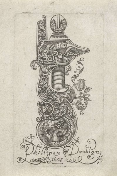 Editor: Here we have "Herdersattributen," or "Shepherd's Attributes," a print etching created between 1772 and 1779 by Jean François Janinet. The Rijksmuseum houses this decorative artwork, and I’m really taken by the linear detail in the composition. What do you see in this piece, in terms of formal elements? Curator: A discerning eye! Indeed, the graphic quality here is undeniable. Consider how the artist has layered object upon object: we have a suggestion of depth through careful arrangement, yet the individual components retain a certain flatness due to the consistent line weight and the relative lack of tonal variation. Do you notice the interplay between organic and geometric shapes? Editor: I do, the musical instruments and armor are rigid, while the flowers and ribbons flow softly. It seems to create an intriguing balance. What about the choice of the burnt umber ink; how does it affect our perception? Curator: Precisely! The monochrome palette contributes to the overall harmony, drawing our focus toward form rather than color. Moreover, the absence of strong chiaroscuro enhances the decorative, almost ephemeral, nature of the print. Do you find the composition balanced, or is there a sense of asymmetry at play? Editor: Now that you mention it, it seems balanced on a central axis, but the distribution of the objects gives it some asymmetry and an appealing visual rhythm. I see how this invites closer inspection of individual attributes. Curator: Excellent. The print certainly showcases Janinet’s technical skill with the etching needle and his nuanced understanding of compositional principles, don’t you agree? Editor: Absolutely, seeing how all these attributes interplay is amazing!