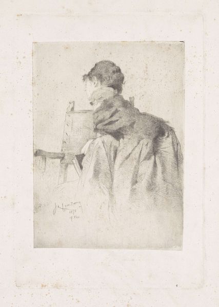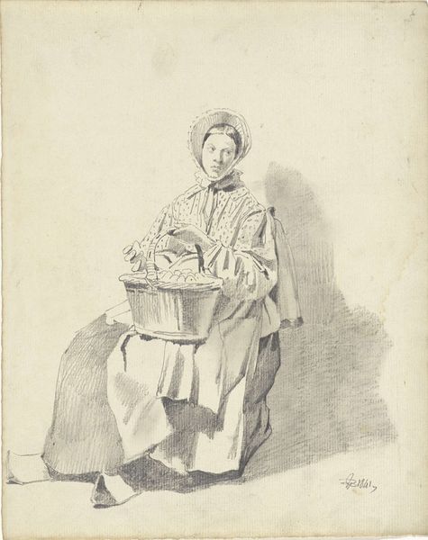 Curator: This intriguing pencil drawing on paper, simply titled "Standing Woman by a Chest," was created by Pieter van Loon in 1842. It's currently held in the collection of the Rijksmuseum. Editor: The immediate feeling is one of somber reflection. The restricted palette focuses the gaze; the chest and the woman become powerful geometric components— a dialogue between rectangle and curves. Curator: Indeed, the genre painting adheres loosely to the Romanticist style, evident in the realistic depiction of domestic life yet also capturing the subject’s inward emotion. The woman's posture conveys a sense of introspection or perhaps resignation. We are invited to question: what does the chest contain? Editor: Chests function as memory containers throughout Western art; repositories of personal history. Is she packing or unpacking? Departure or arrival are the existential, perhaps even ontological questions implied here. The visual weight certainly lies at the bottom of the composition. The skirt anchors the figure, the shadows subtly emphasize the connection to earth. Curator: The clothing does reveal a degree of narrative. Observe the details of her simple garment and head covering; these could reflect not just status but emotional context, too. Note that despite this drawing dating to 1842, van Loon’s treatment, especially his fine use of the pencil, reflects more Realist than Romantic qualities in the overall application of visual codes. Editor: Precisely. She seems suspended in time between both aesthetics. It highlights, to my eye, the universality of such domestic scenes and related iconography. Curator: A domestic tableau, indeed, transformed through expert manipulation of light and shadow. It's van Loon’s structural sophistication that ultimately ensures this small work resonates. Editor: For me, the artist transforms the personal into the universal. The intimate dialogue established in this scene will endure regardless of our ability to unpack specific temporal references.
