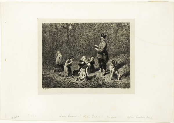 Curator: This is a pencil drawing by George Lodewijk de Wetstein Pfister titled "Ontwerp voor illustratie voor De Kolossus der Negentiende Eeuw door P.J. Andriessen; sc\u00e8ne uit het leven van Napoleon." It dates to between 1877 and 1942. Editor: It feels ominous, doesn’t it? The muted tones, the shadowy forest… a very pensive Napoleon, removed from any glorification. The horses and riders seem to melt into the environment itself. Curator: Indeed. The romantic landscape certainly contributes to that feeling, with its emphasis on emotional intensity. Consider the way the artist uses line and shading to create depth. See how the texture of the trees becomes almost tangible. It demonstrates the academic precision in representing the natural world, yet simultaneously evoking an emotional atmosphere. Editor: Absolutely. One can see Napoleon’s rise through the framework of 19th century political upheaval, painted in tones that reject outright glorification. Is this piece meant as a cautionary tale about imperial hubris, cloaked in the popular appeal of romantic landscape painting? The surrounding text on the document suggests that the picture depicts something "terribly wrong". Curator: A valid question. The work also echoes academic artistic conventions and the way historical painting traditionally elevated its subject. You see elements of classical composition merged with the starker, realist detail that would become fashionable with artists of the time. Notice the interplay of light and shadow on the horses and riders, adding drama. Editor: Yes, that push-pull. Are we meant to admire or critique? This work reveals its story and conceals it at the same time. What does the absence of strong colors represent here? A fading glory? Or a statement of quiet protest? It begs the viewer to consider power, legacy, and narrative framing. Curator: Looking at it formally, there’s certainly that inherent tension within the very structure of the artwork. I appreciate how a simple, almost understated technique delivers such complexity and emotional depth. Editor: Agreed. It is more than a sketch; it invites a broader investigation into the historical, social, and ethical considerations of empire.