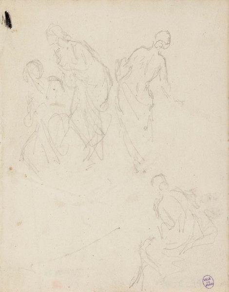 Curator: This is "Studies of Three Women and Two Children, for 'Jason Returning...'," a drawing by Washington Allston. Editor: It feels like a dream, these figures emerging gently from the paper. They're like half-formed memories. Curator: Allston was deeply invested in depicting emotion and historical narratives, embedding them with psychological depth. Note the classical draping, but also how their arrangement hints at a deeper story. Editor: I imagine them as goddesses, maybe from a play. It’s like a glimpse backstage where they are waiting to go on, both powerful and vulnerable. Curator: The unfinished quality actually enhances their humanity. The light touch of the graphite and paper invites us to consider ideals of beauty and maternity at a moment of transformation in art history. Editor: Well, it makes me think of the stories my grandmother told me... strong women whispering secrets across generations. Curator: It’s compelling to consider how Allston positions women as central to his historical vision. Editor: Yes, the drawing whispers of myths, hinting at a rich context.