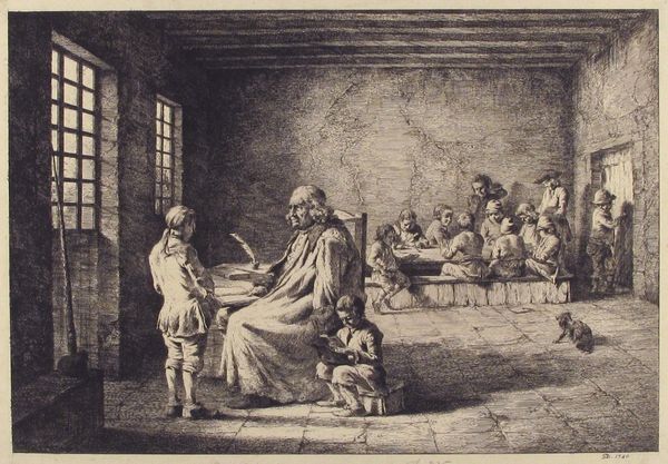 Editor: Here we have Jacob Ochtervelt’s “Itinerant Musicians” from 1665, an oil on canvas. I’m struck by the contrast between the darkness surrounding the musicians and the warm domestic scene in the foreground. What do you see in this piece? Curator: I see a negotiation, or perhaps a subtle power play. Ochtervelt situates these wandering musicians –likely from a lower socioeconomic stratum – within the domestic sphere of a well-to-do family. How does the family react to their presence, and what power dynamics does that reveal? The positioning of the woman and the children versus the shadowed figures of the musicians becomes central to understanding this scene. Editor: Power play...interesting. It's so subtle, but now I see it in the gaze of the woman. It feels very staged though, don’t you think? Curator: Precisely! It’s a meticulously constructed scene, meant to highlight particular societal arrangements. Think about how gender and class are performed here. The musicians, for example, intrude in some ways and yet their interactions are tightly controlled by the lady in the scene. How do you think this work would be received in its historical moment, with its focus on wealth and status? Editor: It seems like a moment captured, but also a carefully constructed commentary. Perhaps it both reinforces and questions social hierarchies at the same time? Curator: Exactly. Dutch Golden Age painting often grapples with these contradictions. The “everyday” is never really that simple, especially when artists use these paintings to negotiate social positions. Editor: I will think about that “everyday” and its complexity now. Thanks. Curator: Me too! Looking closely reveals layers that speak volumes.