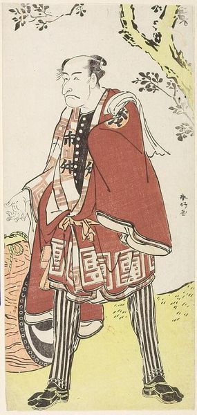 Curator: Here we have Katsukawa Shunko's woodblock print depicting "Actor Ichikawa Yaozo as a Samurai," now residing at the Harvard Art Museums. Editor: The composition immediately strikes me—the figure’s dynamic pose against the relatively flat background creates a compelling tension. Curator: Indeed. Shunko, working within the Ukiyo-e tradition, was deeply engaged with portraying actors, elevating them to a form of popular celebrity. The print would have been produced through a collaborative process involving the artist, carver, printer, and publisher. Editor: The interplay of colors, particularly the red stripes against the subtle earth tones, and the way the fabrics drape, suggesting movement and weight, is masterful. What do you make of the almost blank sky? Curator: The blank sky is likely an intentional design choice to put more focus on the figure. It also reflects the economics of printmaking at the time, as each added color would increase production costs. Editor: A pragmatic choice, yet it amplifies the figure's dramatic presence, making him seem almost suspended in time and space. Curator: Precisely. It encourages us to consider not only the skill involved in production but the social and economic context that influenced the final image. Editor: A compelling interplay of form and function! Curator: Indeed, Katsukawa ShunkÅ’s print invites multiple layers of interpretation, from its aesthetic qualities to its position within the broader cultural landscape.