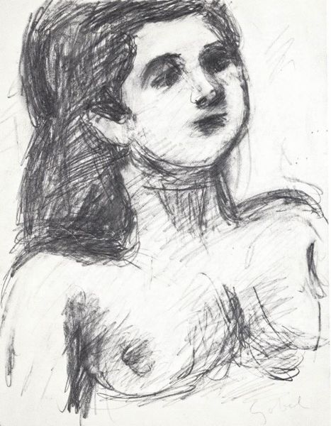 This is a nude drawing by Béla Czobel. He used charcoal, which is evident in the stark contrasts and soft gradations. The image is structured around the interplay of light and shadow that defines the subject. The loose, gestural lines suggest a study in form rather than a detailed portrait, and the composition is balanced, with the figure's head and torso filling the frame. The use of charcoal allows Czobel to achieve a range of tonal values, from the deep blacks of the hair and shadowed areas to the subtle grays that define the contours of the body. Czobel’s drawing reflects a broader artistic concern with exploring the human form and the relationship between line and volume. It can be interpreted as a visual exploration of presence and absence, rendered through the skillful manipulation of light and dark. Notice how the varying pressure of the charcoal evokes both the solidity and the ephemeral quality of human form. This approach, more than a mere representation, embodies a dynamic encounter between artist, medium, and subject.