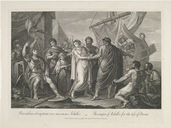 Editor: This engraving, "Jeanne d'Arc ontvangt de gewijde banier," or "Joan of Arc Receiving the Consecrated Banner," made sometime between 1792 and 1797 by Francesco Bartolozzi, it strikes me as a moment caught between reverence and military purpose. What aspects of the print draw your attention? Curator: Oh, what a divine moment to witness, truly. My gaze always drifts to Joan’s kneeling figure, poised and clad in armor, yet utterly humbled. It is almost theatrical. The light seems to pool around her. Isn’t it compelling how Bartolozzi uses the graphic medium to convey texture, from the cool metal of her armor to the Bishop's soft, billowing sleeves? It really elevates this depiction beyond just historical documentation. What does this emphasis of texture mean to you, practically? Editor: It almost makes the scene more believable and palpable. It adds this human quality, I think. The scene feels so… grand. Is that on purpose? Curator: Grand, precisely! Think about the historical context, the late 18th century. Neo-classicism was all the rage. This piece borrows its visual language—order, clarity, idealized figures—to elevate Joan of Arc to near-mythical status. Bartolozzi presents her not just as a warrior, but as a symbol of faith and French national identity. But I do see it slightly different. Where I see a story of faith, you also find this story in a human scale. How about that? Editor: I see it now! Faith meets reality! Curator: Indeed! I see so many layers of intent here! Every time I see this artwork I see an old world telling its old stories in new and wonderful ways. A true neoclassical treasure.