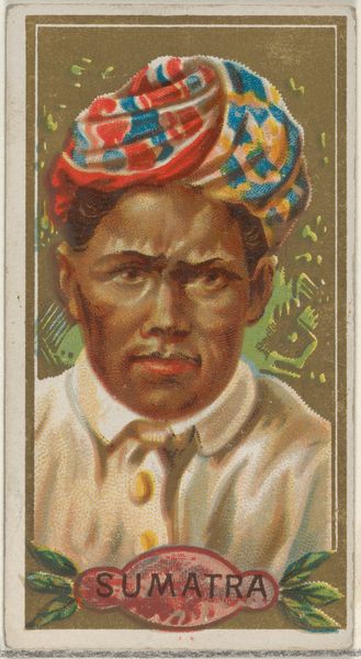 Curator: This peculiar piece is part of a series titled "Types of Nationalities," produced by Kinney Bros. around 1890. It's a coloured-pencil drawing, presented as a print, and housed right here at the Met. Editor: My first impression? It’s a really unsettling caricature. There’s a darkness beneath the colorful veneer; the over-the-top depiction is frankly, deeply troubling. Curator: Indeed. We have to confront the ugly truth of its historical context. This falls squarely within the realm of orientalism and the broader phenomenon of 19th-century caricature. The image, depicting an African man, comes from a time steeped in imperialist ideology, reinforcing harmful stereotypes for the sake of marketing tobacco. Editor: The text reinforces this point; lines like, "But he changed very much in his views, And he even was known to refuse to eat missionary – grew civilized; merry – ‘Sweet Corporal’ banished his blues." This isn't just a portrait; it’s a narrative, a claim about progress defined by colonial standards and "banished blues" sold alongside consumerism. This work perpetuates a highly problematic colonial fantasy, right? Curator: Absolutely. This image needs to be placed alongside considerations of power, racialization, and the construction of otherness during the height of European colonialism. Note the bow tie and brand of tobacco. Even though its material construction involves colored pencil and printed elements, its impact goes beyond aesthetics, speaking to how such visuals normalized racial biases and shaped popular perception. It actively participated in, and continues to be part of, the vocabulary of dehumanization. Editor: It's vital we contextualize these types of caricatures rather than dismiss them. Looking at them offers insight into the power dynamics that influenced so much art and imagery from that time, revealing the machinery behind those historical processes and power structures. This forces critical dialogue. Curator: Agreed. These images should encourage discourse surrounding how we can actively deconstruct those biases within ourselves. It’s essential we face the realities in images such as these, revealing how prejudice became entrenched. Editor: The legacy is potent. And maybe our discussion here provides an equally powerful response, highlighting these artworks with necessary nuance.