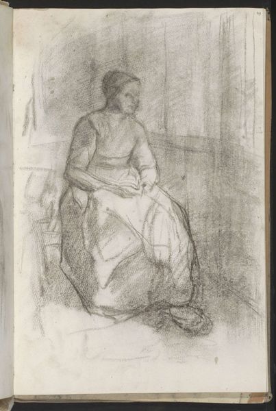 Editor: Albert Neuhuys created this piece, "Young Woman Sitting in an Interior," sometime between 1854 and 1914. It’s a drawing using charcoal and pencil on paper, and it’s currently held at the Rijksmuseum. There's something melancholic and muted about the artwork. What do you see in this piece that might escape a casual observer? Curator: Ah, yes, melancholy… I feel it too. Beyond the superb rendering in charcoal, what strikes me is the *absence* of…well, fanfare. Life. This young woman, swallowed almost, by shadow, by interiority. It speaks of constrained roles, doesn’t it? Look at her posture; almost hunched, definitely not *commanding* the space. Does it feel staged or spontaneous to you? Editor: It definitely feels spontaneous, like a captured moment rather than a posed portrait. Curator: Precisely! I wager Neuhuys sought authenticity over glamour. These genre paintings – seemingly simple scenes of everyday life - often whispered volumes about societal constraints, expectations. It is a genre painting after all, meant to capture everyday life. The woman is a sort of ghost; not spectral, but certainly faded. And you said 'muted'; did you pick that up from the grayscale palette or the interior setting? Editor: Probably both now that I think about it, the grayscale and the enclosed setting heighten the sense of isolation. Curator: Excellent! The grey tones create a dreamscape of shadows. These constraints…do you think the artist feels for the subject? Do you get a feeling about Neuhuys? Sympathy perhaps, or even frustration? Editor: Hmm, I’m not sure about frustration, but I do sense empathy. Almost like a quiet protest against the limitations placed upon women of that era. Curator: Beautifully said! So, we’ve gone from a melancholy sketch to a whisper of social commentary. Not bad for a two-minute exploration, eh? Editor: Definitely puts things into perspective. I will think differently about the subject next time I see it in the gallery. Thank you!