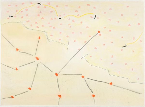 This untitled piece by Gene Davis looks like it was made with pencil and crayon on paper. I love how the drawing feels like a sketch, a moment of thought caught in lines and blocks of color. The pink crayon marks, one a bold stripe down the left, the other a diagonal slash, contrast with the geometric maze that dominates the lower right. That maze, drawn with a pale yellow pencil, is so meticulous, yet it's overlaid with these spontaneous flicks of colored pencil. It’s like the artist is having a conversation between order and chaos, planning and accident. The surface has this lovely, raw quality. You can see the texture of the paper, the unevenness of the crayon strokes. It reminds me a bit of early Brice Marden drawings, but with a pop sensibility. Ultimately, it's in this dance between the deliberate and the accidental that Davis really shines, turning a simple sketch into a window into his process.