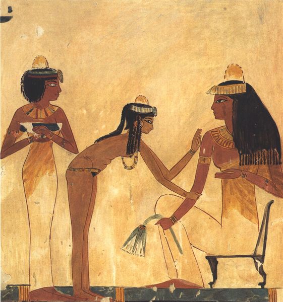 This wall painting, "Nacht Und Taui," from Ancient Egypt, presents a tableau of serenity and symbolic encoding through a structured composition. The figures are delineated by bold outlines with flat colour infills, characteristic of Egyptian art. Consider the linear arrangement and the profile view, which are not attempts at verisimilitude, but formal choices emphasizing clarity and permanence. The hieroglyphs above are not mere decoration but a linguistic and visual system intertwined. The subjects’ stillness and the stylized lotus flowers contribute to a sense of poised equilibrium, and the use of colour signifies specific meanings, setting the scene within a complex cultural framework. Ancient Egyptian art often sought to immortalize rather than merely represent, thus the formal elements here serve a cultural and philosophical purpose. The visual language invites us to decode its symbols, prompting ongoing interpretation and re-interpretation.
