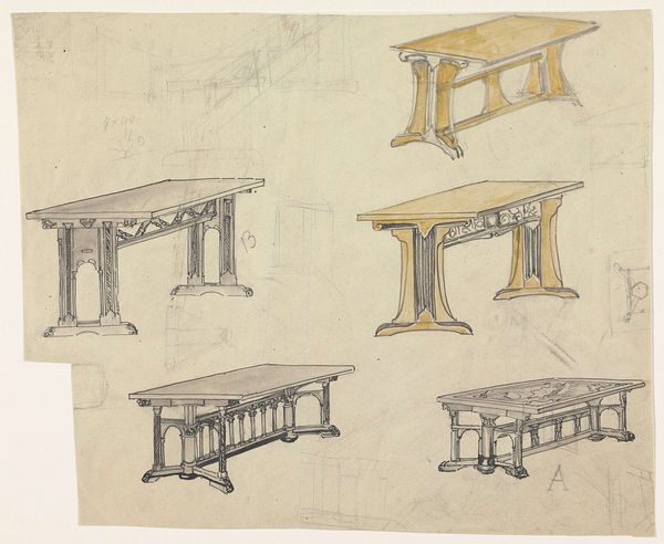 Carel Adolph Lion Cachet made this drawing of table designs, titled "Tafelontwerpen", using graphite on paper. Look at the gentle graphite lines, how they softly suggest form, almost like a whisper of a table. It's all about process here, seeing the idea take shape, rather than a finished product. I love the way the artist allows the sketch to breathe. There's a lightness to the touch, a certain hesitancy in the lines, that feels very intimate. Notice the table at the bottom left, how the details are more pronounced, yet still tentative, like the artist is thinking aloud. This reminds me of the work of Josef Hoffmann, in its exploration of form and function. Yet, unlike Hoffmann's precise geometries, there's a looseness here that invites interpretation. It's a reminder that art, even in design, is always an ongoing dialogue.