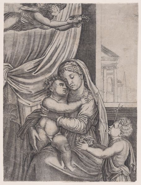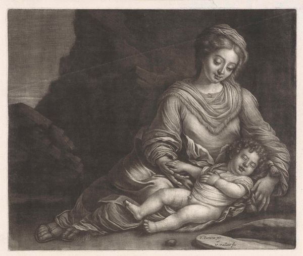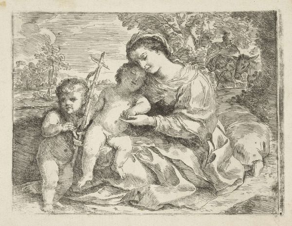 Curator: This is an etching entitled "Maria met kind in een landschap," which translates to "Mary with child in a landscape," dating from around 1690 to 1730, by Simon de la Vallée. Editor: It's immediately striking, the almost dreamlike quality. There's such a tenderness in Mary's gaze as she cradles the child. It feels less like a formal religious piece and more like an intimate, maternal moment captured in the stillness of the woods. Curator: And the setting is interesting, isn't it? The baroque period often saw a merging of the religious and the everyday, relocating sacred scenes to relatable contexts. Consider, too, the evolving role of art patronage at the time. How do you feel that impacts the overall symbolism and emotional effect? Editor: Absolutely, moving the Madonna and Child out of a palatial or celestial setting and into a simple forest scene amplifies the accessible humanity. The landscape feels allegorical to safety, nurturing—a place of refuge. I see an evocation of the "hortus conclusus" imagery—a symbol of Mary's purity and virginity, framed as a safe garden. Curator: And that sense of refuge surely resonates given the social unrest and religious conflicts occurring across Europe at that time, placing additional emphasis on the roles of mother and child. Looking at it through a public lens, this domestic portrayal challenges perceptions. Editor: I find it particularly interesting that her feet are bare. In this scene it draws all sorts of ideas about grounding, closeness to earth, vulnerability... stripping her of earthly trappings. It pulls us back to fundamental symbolism: Mother Earth, the purity of maternal love, protection, which are all visually powerful and affecting even for a modern viewer. Curator: I agree; by stripping the image back to focus on that core message of compassion and protection, it taps into an essential human story. It moves the Holy figures into a shared cultural landscape and brings these figures down to earth. Editor: Yes, it transforms a powerful symbol of protection into a very gentle, intimate human scene that can endure through many different cultural conditions.