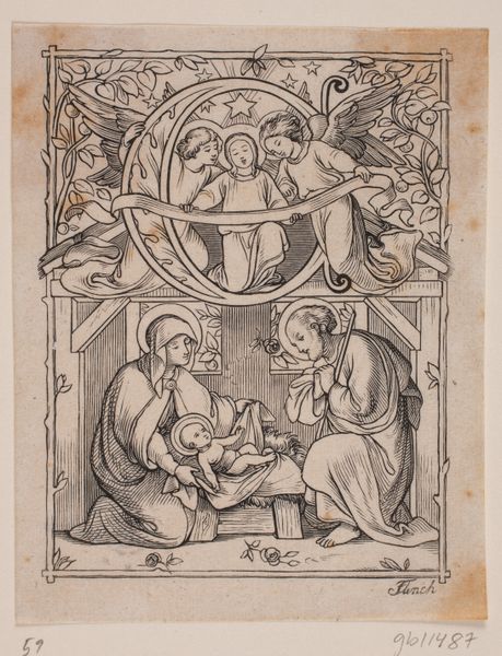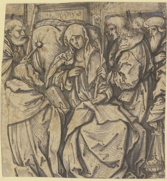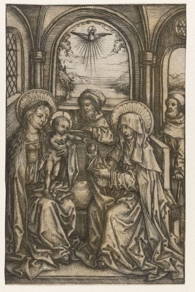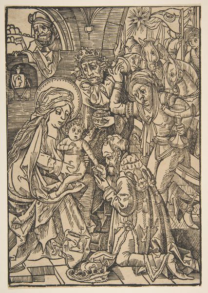 This is "The Entombment," a 6.7 by 4.5 centimeter engraving made by Master S. in the first half of the 16th century. The composition here directs our eye through a series of carefully arranged figures. The linear quality of the engraving emphasizes the contours and emotional weight of the figures surrounding Christ. Note the use of dense, parallel lines to create shadows, contrasting starkly with areas left untouched to represent light. The figures, each framed by a halo, converge towards the lifeless body of Christ, placed horizontally in the lower right. This orientation destabilizes the traditional verticality associated with religious iconography. It suggests an engagement with humanist values. The visual language of Master S. reflects an era of religious reform. The formal structure of "The Entombment" does not simply illustrate a biblical scene, but invites a re-evaluation of traditional religious symbolism through the lens of evolving artistic and philosophical dialogues.