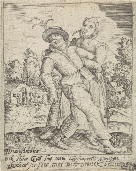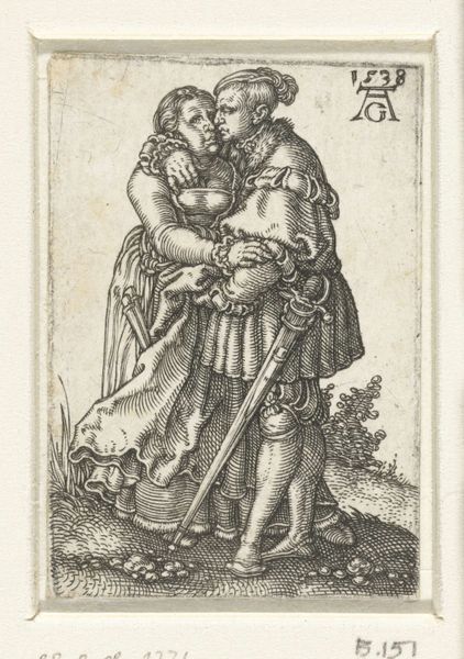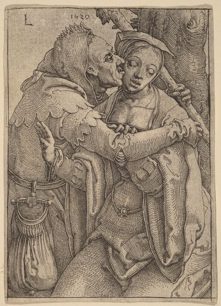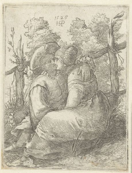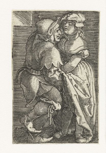 Curator: Right, let's talk about Sebald Beham's "Boeren liefdespaar," a captivating engraving from 1521 here at the Rijksmuseum. A "peasants’ love couple", which gives away what is in front of us. What springs to mind for you with this artwork? Editor: My first thought? An anxiousness. All those tightly packed lines create a tension, like something is about to break. There's a dark humour that bubbles beneath the surface of this so called loving peasant couple. Curator: An interesting perspective. It certainly dives headfirst into the genre scenes that were gaining traction during the Northern Renaissance. The subject isn't some highfalutin mythological tale. Beham's capturing a slice of life. And his life. Because it contains also an engraving from Beham after a Dürer. Editor: Well, if we look at it technically, Beham's masterful control of the engraving tools really shines through. Think about the socio-economic status involved! Each cut on the plate, each line adding value, a laborious task. Engraving as a skilled trade. It wasn't about virtuosity as much it was about getting the picture out as multiple, repeatable commodity. What´s more, Dürer had set up in the recent past his printing studio which makes the comparison not only from the motif sides very attractive. Curator: The line work does give the couple a tangible weight, yet in some sense Beham also lightens it, or at least brings in an air of realism and rawness through this focus on material and medium, doesn't he? How many other of our contemporaries, or the couple’s contemporaries, would´ve portrayed the poor doing anything at all that might approach the courtly notion of "love"? Instead, they look at one another suspiciously. Even he. Editor: And consider the circulation of these prints, this technology changed social perception. Prints like these were relatively accessible compared to paintings. Spreading images and ideas, leveling social classes by the mode of consumption. And perhaps, this “unease” is on purpose. To the couple to get to work at their crafts, maybe? Curator: Or get rid of the big knife the man has by his side! I like your read of "unease." It strikes me as more poignant when looking at it now, thinking of everything this period represents through artistic form: new art-making possibilities, class critique. I think this makes this quite simple print unexpectedly…human. Editor: Exactly! The work moves between skill and social standing, all tied to materiality, which gives it such surprising impact.