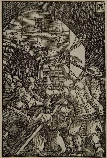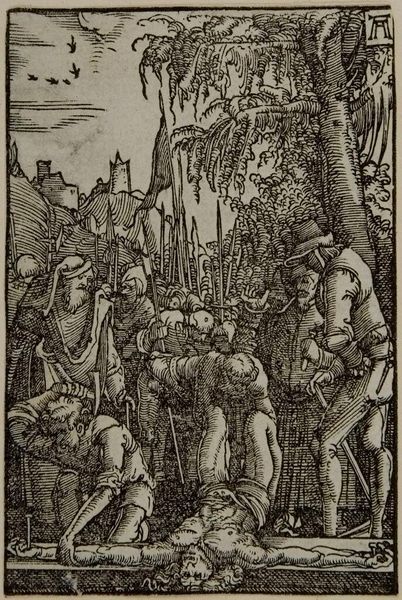 Curator: Look at the chaotic energy in this woodcut, likely made in the early 16th century by Albrecht Altdorfer. Editor: The density of lines is striking; it almost feels claustrophobic. The figures are packed together, all rendered in such detail, yet indistinct. Curator: This is "Ecce Homo," a depiction of Pontius Pilate presenting Christ to the mob, but it speaks to broader themes of power, corruption, and the abuse of authority. Editor: The sun-like form in the upper left is intriguing. It feels like a fractured, almost weaponized symbol of enlightenment. Is it meant to highlight the ignorance of the crowd? Curator: I think it's meant to highlight how society can twist the meaning of symbols to justify injustice. Even the divine can be perverted by those in power. Editor: It's a potent reminder of the dangers inherent in unquestioned authority and the power of visual symbols to manipulate public opinion. Curator: Indeed, it invites us to consider our own complicity in systems of oppression, even today.