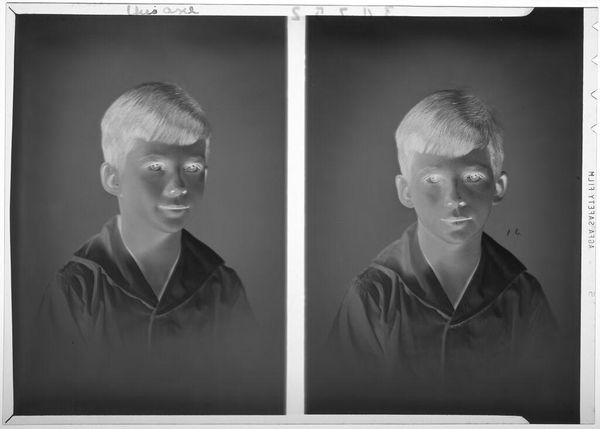 Editor: This is an untitled photograph by Martin Schweig of a young boy in a sailor collar. It has such a formal, almost haunting quality. What do you see in this piece? Curator: I see the construction of identity, particularly masculine identity, being imposed upon this child. The sailor suit, a symbol of naval power and colonial exploration, is here a tool of socialization. Editor: So the clothing isn't just an aesthetic choice, but a statement? Curator: Exactly. Consider the historical context. What does it mean to dress a child in the garb of empire? It speaks to societal expectations, the roles this boy is expected to fulfill. Editor: I hadn't thought about it that way. It's unsettling. Curator: Indeed. It forces us to confront the uncomfortable aspects of our past and how they continue to shape the present. Editor: I'll never look at sailor suits the same way again.