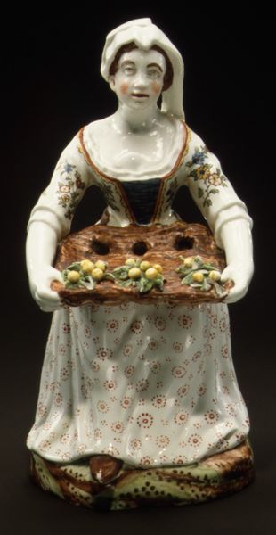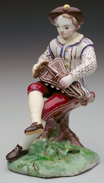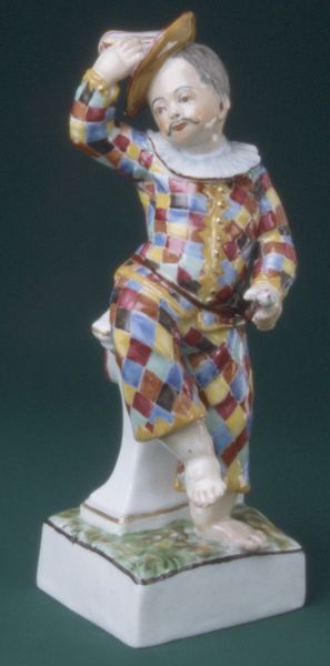 This porcelain sculpture, produced by the Gardner Manufactory, presents a Harlequin figure dressed as Columbine, characters drawn from the Commedia dell'Arte tradition. The Commedia dell'Arte, which originated in Italy, was known for its masked characters and improvised performances. In this context, the Harlequin, traditionally a male servant, cross-dresses as Columbine, his female counterpart. This act challenges the rigid gender roles of the time, opening up a space for questioning societal norms. The mask and costume—vibrant and patterned—serve as a form of disguise but also as a means of exploring identity and performance. This sculpture invites us to consider how clothing and masquerade can be a method for social commentary. It captures a sense of playful ambiguity, reflective of the emotional complexities inherent in defying social expectations.