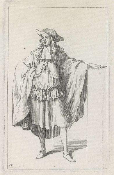 Curator: Here we have "Heer van voren gezien, leunend op wandelstok," or "Gentleman Seen from the Front, Leaning on a Walking Stick." Sèbastien Leclerc I created this pen drawing around 1685. What do you think when you see this work? Editor: Immediately, I notice the figure's pronounced artificiality. The lines are so precise, almost diagrammatic. He’s striking a pose, certainly conscious of being viewed. Curator: Yes, Leclerc’s lines carry a tremendous weight of expectation! In 17th-century art, we are so often reminded that pose and presentation served to reinforce social hierarchies. Leclerc's attention to detail speaks volumes about the sitter's wealth and status. Think about his curled wig, for instance, or the very prominent sword. These symbols project immense power, but can we call into question what those icons represent today? Editor: Exactly. A portrait is not neutral; it performs ideology. This dandy, so reliant on external symbols of rank and prestige, projects authority at a time when absolutism in France was increasingly being contested by emergent bourgeois forces, right? This image almost feels like an emblem of a bygone era already in its own time. Curator: I’m particularly drawn to the walking stick as a symbolic artifact. While clearly practical, its appearance also tells us that this figure perhaps held some position, signifying access, or wisdom. Note his delicate hand poised gracefully upon the top—a touch of refinement amidst a tableau of symbols, like an old memory kept polished, almost. Editor: It makes you wonder about access to what, though, and for whom? Was this gentility used as a veil over less-than-genteel behaviors, perhaps, as a way to avoid or dismiss questions regarding economic inequalities? And I have to point out that his refined affectations exist in stark opposition to, say, images of farmers or women. What values do we uphold when we glorify these kinds of characters and their presentation? Curator: And in our world, where symbolic markers can shift so rapidly, seeing how carefully constructed that sense of ‘natural’ authority was can be helpful. By studying historical symbols, perhaps we can glean insight to see our own time more clearly. Editor: True. Leclerc’s meticulous hand reveals much about what was deemed important—or what the powerful *wanted* us to believe was important. It's a very revealing peek into the past.