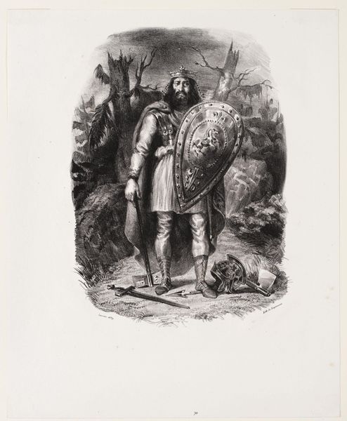 Editor: This is Victor Nehlig’s “Sentry under Reign of Charles IX,” an etching. The sentry’s posture suggests exhaustion and disillusionment. What can you tell me about the social context that might have influenced Nehlig's work? Curator: Consider the reign of Charles IX, a period marked by intense religious conflict and the St. Bartholomew's Day Massacre. Does the sentry's weariness reflect a broader societal fatigue and the moral compromises demanded by such violence? Editor: That adds a new dimension. It’s not just a tired soldier, but maybe a representation of a society strained by religious persecution. Curator: Precisely. And consider how the lone figure might symbolize the isolation and vulnerability of individuals caught within larger systems of oppression and power during times of brutal conflict. Editor: I see the sentry as an individual bearing the weight of collective turmoil. Thanks for this deeper look! Curator: It’s crucial to view art as a lens through which we can critically examine historical injustices and their lasting impact on society.