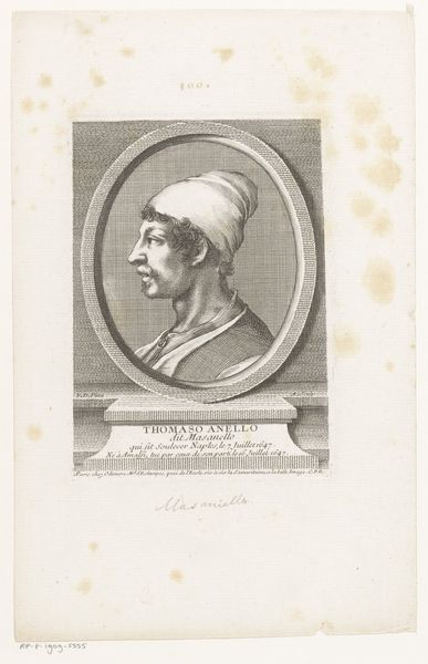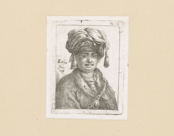Curator: It’s a fascinating portrait isn’t it? Norblin de la Gourdaine's "Head of Man with White Hat," created between 1774 and 1789 using etching, ink and paper. What strikes you about it? Editor: The delicate lines! The whole piece seems so fragile. It looks almost like a quick sketch, but it’s an etching – that seems like a labor-intensive process. How do you interpret it? Curator: It makes me consider the production and consumption of images at that time. Etchings like this were often reproduced, circulated widely, almost like a proto-mass media. The artist isn’t just depicting a man, he’s engaging with a system of visual representation, right? A way to distribute the image and persona. Editor: That’s interesting. So, it's not just about the individual portrayed, but also about the mechanics of reproducing and sharing images using etching techniques and accessible materials like paper and ink at that time? Curator: Precisely! Think about the labor involved in creating the printing plate versus the relative ease of producing multiple prints. It democratizes access to the artwork in a way that painting never could. It asks us to think of this labor in material terms and contextualize the artist in terms of accessibility and potential consumers of his medium. The "white hat" also is clearly indicative of someone's class, do you think this may provide some sort of distinction in production for these prints? Editor: Absolutely. The etching process implies a level of craftsmanship and production inherently connected to its distribution, which could have created a different audience or have different connotations from paintings, right? Thanks. Curator: Exactly! Considering art through the lens of its material production really reframes how we understand its social impact. Something to think about.