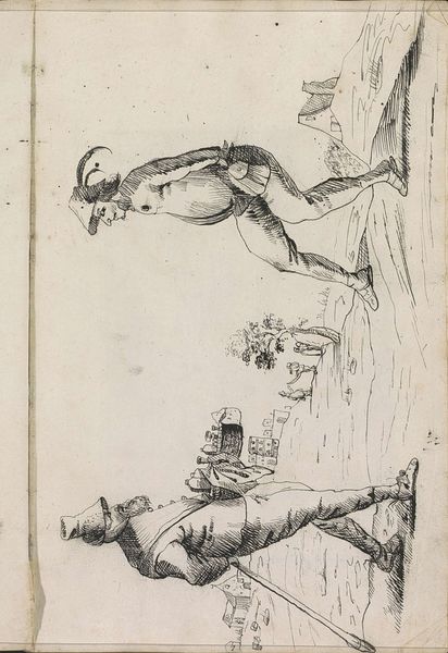 Hendrick van Beaumont sketched, with pen in hand, this drawing of figures in a landscape. Though Beaumont is less known, his work provides an interesting window into the lives of ordinary people and the cultural dynamics of his time. The two figures are distinguished by their activities and attire. One is a traveler, burdened with a backpack, possibly indicating a life of transience or trade. The other, identified as a dancing farmer, seems carefree, indulging in a moment of revelry. The contrast suggests a nuanced view of rural life, acknowledging both its hardships and its moments of joy. Beaumont perhaps captures the essence of identity as tied to labor, leisure, and the simple landscapes that define their world. Through Beaumont's sketch, we are offered an intimate look into the lives and identities of individuals navigating their world, a world where dance and daily grind coexist.