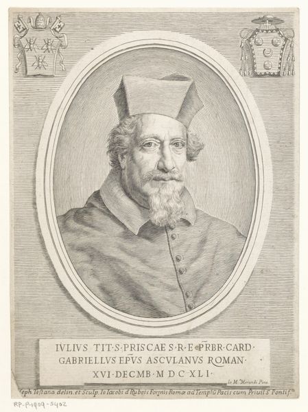 Editor: So, this is "Portret van kardinaal Camillo Melzi," dating from between 1658 and 1679, made by Giuseppe Maria Testana. It's an engraving, using metal as the medium. It's interesting how the lines create so much detail. What can you tell me about this piece? Curator: It's fascinating to consider this portrait through a material lens. Think about the copper plate, the tools used to incise the image, the ink carefully applied and then pressed onto the paper. The *act* of making becomes so apparent. Editor: So you are talking about process and craft rather than artistry? Curator: Absolutely. While we can admire the skill in rendering the cardinal's likeness, what intrigues me is the *system* of production. This wasn't a unique, one-off creation for a wealthy patron. Prints like this were produced in multiples, becoming a form of visual currency, circulating images of power. How does that mass production impact its meaning? Editor: I hadn't considered the social context of its production like that. It feels much more accessible than, say, an oil painting meant only for a private collection. The print allows the Cardinal's image to circulate more widely, acting almost like early PR. Curator: Exactly! It democratizes the image, albeit within the confines of its intended social stratum. Now consider the engraver, Testana. He is a craftsman participating in a commercial venture. Where does his skill fit into a hierarchical artistic system? Is he elevated or subsumed by the project? Editor: It blurs the line between art and craft in an interesting way. It also really speaks to the dissemination of power. Curator: Precisely. This close examination of process has highlighted how value and meaning can reside as much in production as in representation. I've come to view Baroque portraiture, not just as celebratory of powerful persons, but instead, more interested in how systems affect the creation and subsequent consumption of powerful art itself.