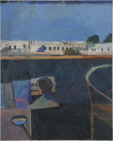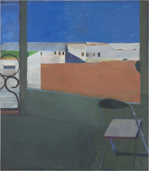 Curator: Let's consider Richard Diebenkorn’s "Interior with Doorway," an oil on canvas completed in 1962. It strikes me as a visual articulation of in-between spaces, both literal and figurative. The threshold is painted with such palpable tension; I find myself pondering questions of access and exclusion. Editor: My first thought? A melancholy waiting room. It has this eerie, still feeling. Like the quiet before a storm, or maybe the aftermath. The light filtering in feels distant. That lone chair... does it feel lonely to you, too? Curator: I'm glad you mentioned that loneliness because when viewing this work through the lens of post-war American society, a prevailing sense of alienation becomes really prominent. There's the interior, almost claustrophobic, countered by the exterior promising some kind of freedom. Editor: Exactly! It's as if someone paused, just for a moment, catching a breath, trying to make a decision, what is beyond that door... The colours are muted and thick, like looking through fog. It looks plein-air; it's funny, it has the stillness of an Hopper’s landscape painting but a sense of abstraction, almost as if something needs to be expressed more then it has to be seen... Curator: I agree entirely. This painting sits at a crucial juncture within Diebenkorn’s trajectory. Prior to this piece, he was largely occupied with pure abstraction, yet here, elements of figuration re-emerge and give the viewer space for questions... Is this the artist home? An actual street corner he painted from nature? We are left with uncertainty. Editor: And yet it’s also such a human moment, don’t you think? That quiet contemplation; we've all stood there in the doorway, right? Lingering. Uncertain about stepping into what comes next. Perhaps it could be considered the most political attitude possible—uncertainty. Curator: An elegant provocation! Indeed, this doorway functions as a threshold onto complex social and political questions inherent to any epoch. Editor: Looking at it now, I wonder how Diebenkorn himself was at a point of no return, not in the landscape nor in pure abstraction... like us, viewers, he's there in-between. Curator: Thank you, this really helped crystallize what I appreciate in this painting and artist. It seems what endures most is Diebenkorn’s ability to invite continued reflections and personal engagement with our contemporary moment. Editor: It does feel special in that way. And isn't it nice to find that the art it's good if we, as viewers, stand with the artist? And even more if we can linger there for a little longer.