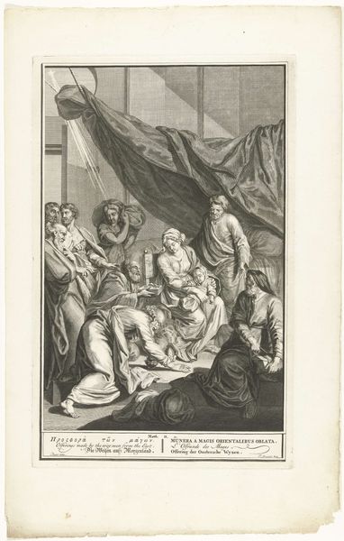 Curator: Here we have "Christ with the Doctors in the Temple," a Baroque engraving dating roughly from 1679 to 1728, attributed to Abraham de Blois, currently held at the Rijksmuseum. My initial feeling is one of mild oppression; it is so dark and closed-in. Editor: Oppression is an interesting response. I am drawn to how it illustrates the challenging relationship between institutionalized wisdom, embodied by those scribes in the Temple, and radical insight, here presented through the figure of young Jesus. Look how small he is and yet how central he sits on the picture plane! Curator: Yes, but note how they all direct their gazes and hand gestures to the small figure. He’s very clearly the center of attention. I can feel a potent narrative thread at work; these religious leaders appear equal parts intrigued, disturbed, and, dare I say, threatened. Their tradition is at a crossroads of innovation. Editor: Agreed, his presence signifies a pivotal shift. In a broader social and historical context, the Baroque style aimed to instill reverence and communicate complex theological ideas to wider audiences. But this image…it feels like a subtle questioning. Do we blindly accept authority, or challenge it with compassion and individual knowing? Curator: Symbolically, the closed space emphasizes that tension—between a sacred past and an evolving spiritual consciousness. It creates this fascinating dichotomy, drawing from and potentially questioning traditions of religious iconoclasm that had deeply disrupted European life just decades before its creation. It could simply be read as illustrating the story in the gospel of Luke, of course, but that rendering also embodies, I feel, the cultural shifts then happening. Editor: Perhaps the visual darkness even emphasizes the obfuscations, the potential blind spots that can plague even learned and supposedly enlightened institutions. The young are literally always the future, always positioned to create a reckoning, but especially so when society enters moments of paradigm shift. I think the placement in the archives of the museum lends added nuance and gravity, don't you think? Curator: The darkness and complexity may serve a valuable function of honoring and questioning both cultural progress and regression through visual art. Perhaps De Blois is urging us to sit longer in moments of difficulty, moments of confusion, where progress and tradition can seem opposed to each other in society and culture. Editor: It’s images like this that demonstrate why engaging with older forms and histories can equip viewers to tackle a multitude of present-day and pressing cultural dialogues. It helps build, and honor, our collective memory.