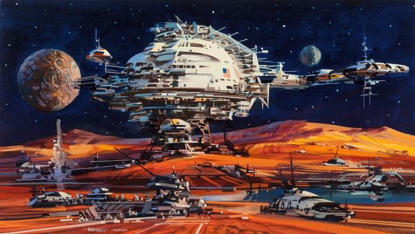 Editor: So, this is John Berkey’s cover for the paperback edition of "Run to the Stars", painted in 1986, supposedly in oil. I’m really struck by the sort of retro-futuristic feel; the image gives me an industrial feeling mixed with the aspiration to push into the future. What do you make of it? Curator: I see a compelling vision of speculative production. Consider the medium: oil paint, typically associated with established art historical canons, here applied to mass-produced book cover, effectively collapsing boundaries between ‘high’ and ‘low’ art forms. How might the process of translating this original painting to a printed paperback, meant for wide distribution and consumption, impact our understanding of its materiality? Editor: That's interesting. It is like an artistic statement reproduced as a commercial artefact. I mean, it's mass produced... doesn't that affect the aura of the original? Curator: Precisely. Berkey’s detailed cityscape in the backdrop, seemingly forged from steel and concrete, invites us to ponder on the resources required to construct such a metropolis and the labor involved. The central spaceship becomes a symbol of technological advancement inextricably tied to the materials that form it. Where do these materials originate? Who mines and fabricates them? Editor: Right, thinking about the resources necessary... and then it's meant to get tossed around in backpacks, possibly discarded after reading. The transience is an interesting contradiction. Curator: Indeed. And this cover art, initially designed to entice consumers, becomes a poignant example of capitalist cycles of production, consumption, and, ultimately, potential obsolescence. How does understanding the social life of this paperback change your perception of its aesthetic value? Editor: I never considered all these angles. Now, I'm more aware of the story this cover communicates, beyond the book itself. Curator: Seeing art through the lens of material conditions enriches our understanding beyond aesthetics alone. It connects the image to the complex social and economic web in which it was created and consumed.