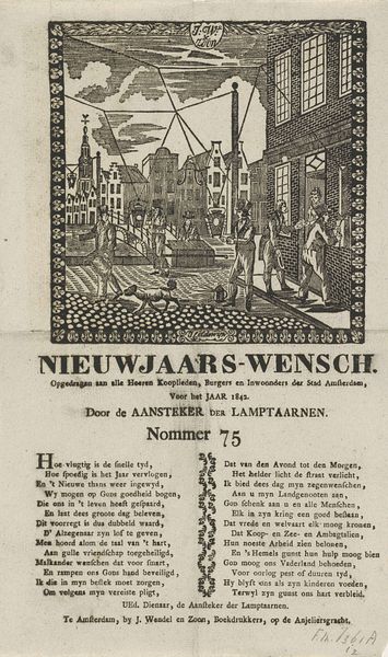Curator: Let’s explore this rather interesting piece entitled “Nieuwjaarswens van de Amsterdamse nachtwacht voor het jaar 1837,” created around 1836-1837 by the Gebroeders Tollenaar. It's an engraving. What's your initial take? Editor: Bleak, I’d say. It has this kind of...grim formality, even though it’s also strangely endearing. Almost feels like a town crier’s announcement crossed with a religious pamphlet. Curator: Precisely. This was, in essence, a New Year's greeting from the Amsterdam night watch, dedicated to the city's merchants, citizens, and residents at the start of 1837. It showcases not just civic pride, but the role that labor plays in upholding the social fabric of the city, doesn’t it? Note the depiction of the cityscape—it provides the very setting for the guardsmen at center. Editor: Materially, this feels utilitarian. A practical, almost proletarian, kind of art. I mean, an engraving serving as municipal PR! It's intriguing how they mixed the visual representation of their watch with that dense, rather solemn, block of text beneath. Do we know who the author was? Curator: The night watchmen are named, actually. Look to the bottom. UEd. Dienaren, M. van der Hijden, H. ter Poorten, G. Klijn, H. Krager. It would have been produced and sold by the widow of C.G. Kok. Consider the networks involved in creating and distributing these sorts of materials. Editor: Kok—the production houses always had such wonderfully alliterative names, it almost felt like branding...inadvertently creating their own iconic mark, much like high end designers nowadays. It feels very functional. This wasn't made to hang in a gallery; this served as social messaging to convey sentiments of the guards. Curator: It also raises interesting questions about access to art. For the working class, objects like this print provided affordable, if limited, exposure to art. This wasn't some oil painting sequestered in a wealthy home. Editor: Right, print as a populist medium, shaping consciousness and solidifying social order at a key historical point...That somber aesthetic—the thin lines, the crowded text. There’s something inherently melancholic. Maybe that's the weight of responsibility and societal role literally pressed into paper? Curator: Perhaps that says more about our contemporary sensibility than the piece itself. Nevertheless, seeing such ephemeral artifacts contextualizes their place as essential civic rituals. Editor: Well, however you read the emotional state of the city, it does highlight art’s relationship to civic life... the humble labor involved in its production to that grand tower lurking in the background... Curator: Indeed. Thank you for your reflections.