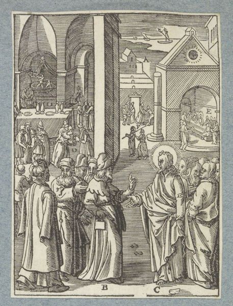 Curator: We're standing before "Christus en de overspelige vrouw," an engraving crafted around 1629 by Christoffel van (II) Sichem, here on display at the Rijksmuseum. Editor: It strikes me immediately as a moment of high drama, yet rendered with incredible stillness. The lines, so sharp, almost vibrate with contained energy. Curator: Indeed. Sichem masterfully employs the linear style of Baroque printmaking to convey a complex narrative. Notice how the composition, framed by classical columns, creates a stage for the encounter between Christ and the adulterous woman. The background scene of people ascending steps toward a doorway suggests societal judgment while the main group occupies the immediate foreground. Editor: Absolutely, it's about the clash between sacred mercy and societal law. Those columns feel weighty, like the pillars of patriarchy bearing down. The woman, vulnerable, is quite literally cornered, dragged before Christ. One might also note the city visible through the rear portal seems claustrophobic. Are there possible relationships, here, between power and virtue? Curator: The city, or more particularly the "Gate to the City" holds rich iconographic potential here. But perhaps equally central is how Christ challenges the moral high ground of the Pharisees, forcing them to confront their own potential for sin and hypocrisy. Consider the gaze—or the lack thereof—directed at the woman. She embodies the marginalized. Editor: That's so crucial. We must consider, then, that in depicting this very public shaming and the near certainty of harsh judgment, Van Sichem’s work highlights the precarious position of women throughout history and how institutions use such shaming to consolidate and strengthen its power. The halos are also very pointed: who are we taught to believe, or accept, as morally "good"? Curator: The artist invites contemplation of grace, judgment, and redemption—universal themes that remain relevant through the ages. Note the details that hold continuity over time: an archway as access and transition, the central place of the village (society), how a gesture or a glance signals assent and moral endorsement. Editor: For me, the image evokes feelings of unease, reflecting on the enduring struggle between empathy and dogma, the personal versus the political. Its questions around shame and authority resound today. It is quite remarkable that something so “old” is perpetually "new." Curator: A remarkable image, wouldn't you agree, reminding us that compassion can indeed challenge deeply embedded structures?