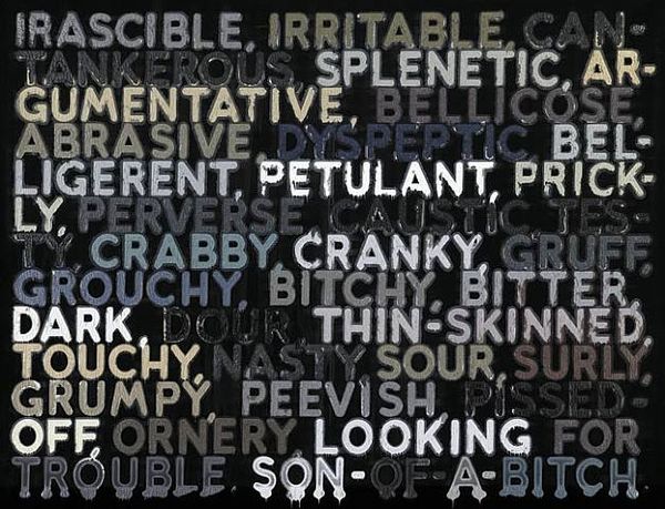 Mel Bochner made 'Vulgar' without specifying when, or how, but, from what I can see, it looks like oil paint with maybe some additives. Look at how the letters, like these little islands of meaning, are popping against this dark, abyss-like background. It’s like Bochner is digging into language, isn’t it? He's almost sculpting with paint, pushing and pulling the medium to give weight to each word. See the word ‘Crass,’ how the paint is built up, thick and almost crusty? It's visceral, you can almost feel the texture. This materiality, the sheer physicality of the medium, is key. The brushstrokes aren’t hiding, they’re flaunting themselves. Bochner reminds me a bit of Ed Ruscha, in the way he deals with text as image. But whereas Ruscha is smooth, Bochner is all texture, a kind of anti-smoothness that embraces the messy, the imperfect. The painting invites us to consider the fluid and subjective nature of language itself. There’s no right answer, just a delicious, uncomfortable ambiguity.