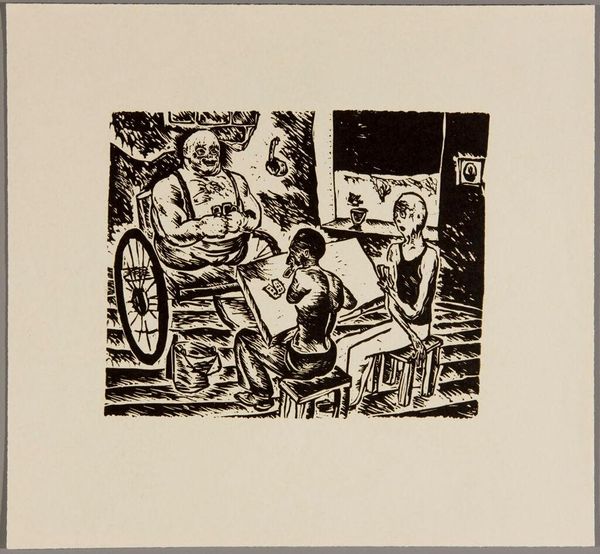 Editor: This stark linocut, "Overpass over Railroad Tracks" by W. Mezentseva, feels incredibly heavy. The industrial scene and the injured figure evoke a sense of struggle. What do you see in this piece? Curator: I see a powerful commentary on industrialization and its human cost. The injured man, set against the backdrop of what seems like either production or destruction, embodies the vulnerability of the working class. Editor: So, it's about the social impact of industrial progress? Curator: Precisely. Consider the artist’s choice of stark black and white – it emphasizes the harsh realities. What narratives about power dynamics and social inequalities does that visual choice suggest to you? Editor: It definitely highlights the contrast between progress and the people left behind. I'll never see linocuts the same way again. Curator: And understanding that allows us to challenge the dominant narratives of progress and question who truly benefits.