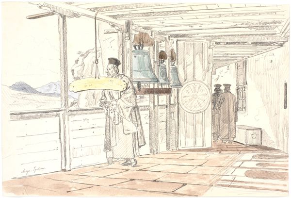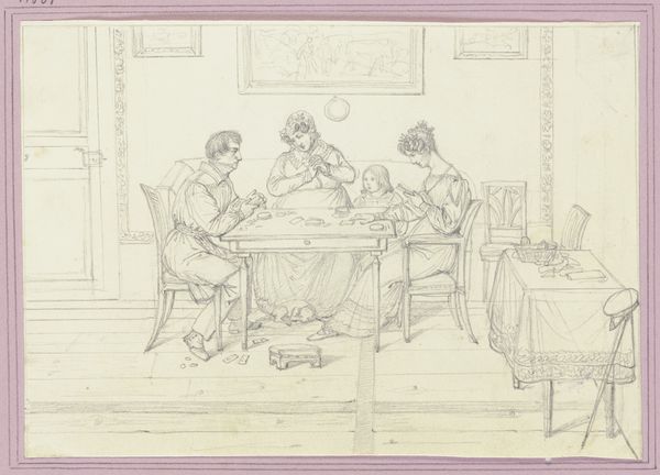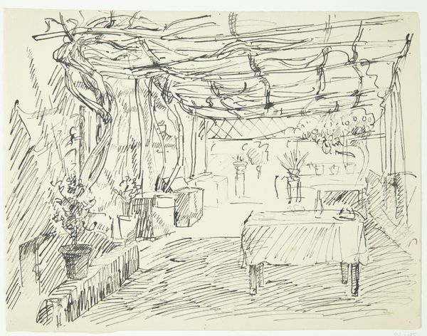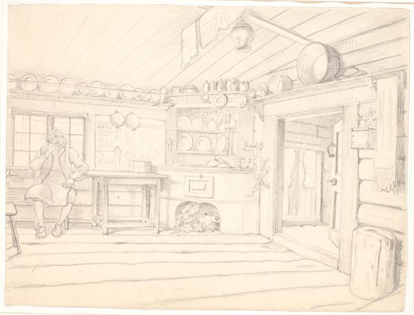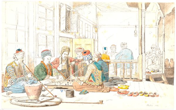 Curator: This ink, pen, and pencil drawing, made in 1836, is Martinus Rørbye's "The Interior of a Turkish Cafe." The artwork resides here at the SMK - Statens Museum for Kunst. What's your immediate take on this? Editor: A quiet intimacy. There’s a languid quality in the pose of the figures that I find quite striking, as if time moves differently within this space. Curator: Rørbye was part of the Danish Golden Age, yet his travels distinguish him. This drawing, categorized within Orientalism, speaks volumes about artistic exchange and representation during that era. What’s crucial here is understanding the labor and materials involved. Paper, ink, and pencil—relatively accessible, aiding portability. The very act of sketching emphasizes the artist’s presence and process of recording observations in situ, no? Editor: Exactly. We can't ignore the power dynamics inherent in Orientalist depictions. Who is granted the privilege to represent whom? How does Rørbye’s identity as a European artist shape the narrative? Considering his gender and social standing will help unlock different perspectives and understanding the work as situated within a specific socio-political context. Curator: Certainly. It seems Rørbye's careful rendering of textiles and architectural details invites us to consider the culture as seen through European eyes, while also reminding us of the materiality of artistic representation. Editor: It’s also important to examine the gaze involved. Who is this work for? Who gets to participate, or is made an object of curiosity? I find myself questioning if it perpetuates stereotypes, or if the rendering allows for genuine appreciation of another culture. The passivity of some figures could play into orientalist tropes. Curator: Perhaps. What's evident is the way Rørbye constructs this space, focusing our attention on the objects and how they shape the experience of those within the café. Even the seemingly mundane, like the textiles, or the serving paraphernalia hint at production practices. Editor: Indeed. And the positioning of the artist, capturing it from a remove as an outsider to these scenes – that is something that must be kept in mind as well. But that could be something valuable to observe within his art itself, if read with critical awareness of the history involved. Curator: Well, it certainly gives us pause to consider both artistic creation and the complex interplay of cultures. Editor: Precisely, allowing us to better understand these works in connection to societal context.