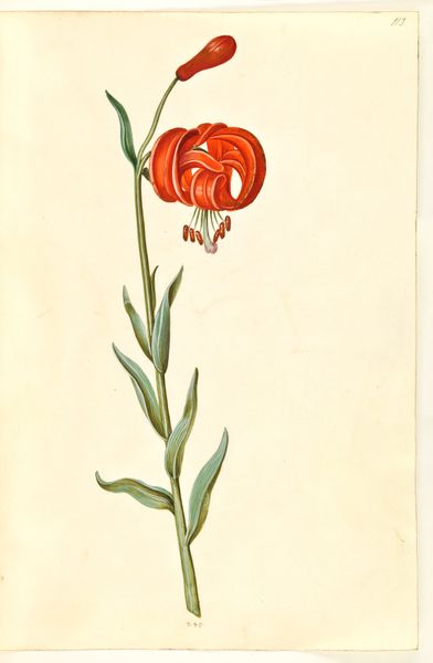 Hans Simon Holtzbecker made this watercolor on vellum of a Lilium martagon, also known as a Turk's cap lily, most likely in the mid-17th century. Holtzbecker lived in a time when the scientific and artistic study of nature was flourishing, yet access to knowledge and resources was highly determined by social standing. Holtzbecker, as a male artist, would have had opportunities unavailable to women. While botanical illustration was one of the few avenues for women to participate in the art world, their contributions were often overlooked or attributed to men. Consider the labor involved in such precise depiction. Holtzbecker painstakingly captured the lily’s delicate petals and intricate spotting. As you look, think about the societal structures that shaped both the creation and reception of this image. The work is not simply a rendering; it is an artifact of its time. This image invites us to consider both the beauty of the natural world and the ways in which social structures affect our understanding and appreciation of it.