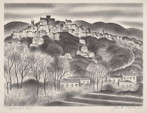 Editor: This is "Monterde" by Valerie Thornton, a print from the Tate collection. It shows a densely packed town under a looming hill. I'm struck by how the buildings seem to almost climb on top of each other. What's your interpretation? Curator: It's interesting how Thornton uses the print medium to depict the architecture. The textures and tones give a sense of a historical place, perhaps even a fortified one, consider how the town is presented as a collective entity, almost defiant in its close-knit structure. What statement do you think the artist is trying to make? Editor: Maybe it’s about the enduring nature of communities clinging to tradition? Curator: Precisely! And it also prompts us to think about the socio-political dynamics inherent in these landscapes, how power structures shaped the environment, and how communities navigated those forces. Food for thought, isn't it?