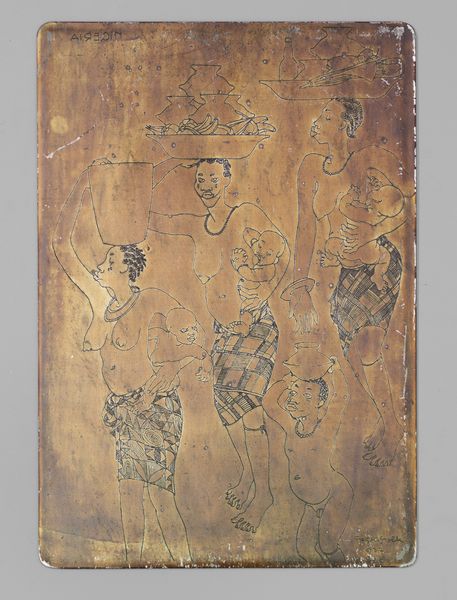 Julie de Graag created this woodcut, titled *Kruik en schaal*, which translates to Jug and Bowl, sometime before 1924. The print strikes us with its earth-toned palette and the artist’s unique approach to texture. The composition, though simple, is thoughtfully structured. De Graag uses a combination of horizontal and vertical lines to create depth and perspective. Notice how the lines on the jug curve to suggest its volume, while the background employs dense, vertical marks which contrast with the smooth surface of the vessels. This interplay of textures enhances the overall visual experience, inviting you to explore the tactile qualities of the print. De Graag manipulates the semiotic conventions of still life to make us aware of the process of representation itself. The jug and bowl are not merely objects; they're carriers of aesthetic intent, prompting us to reflect on the relationship between form and function. The roughness of the woodcut medium, combined with the stylized rendering of the objects, brings forth a meditation on art's ability to transform mundane subjects into objects of contemplation.