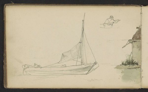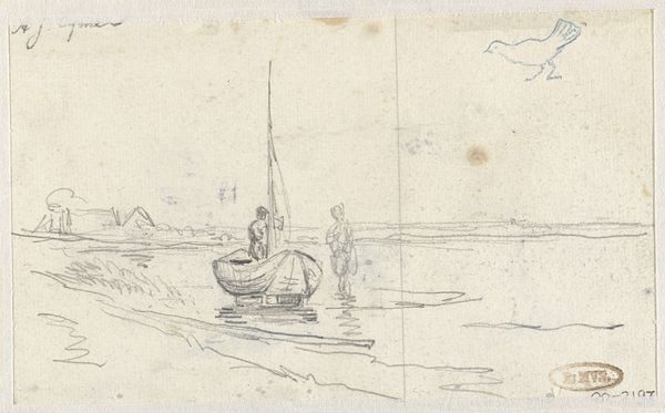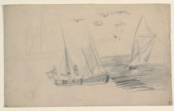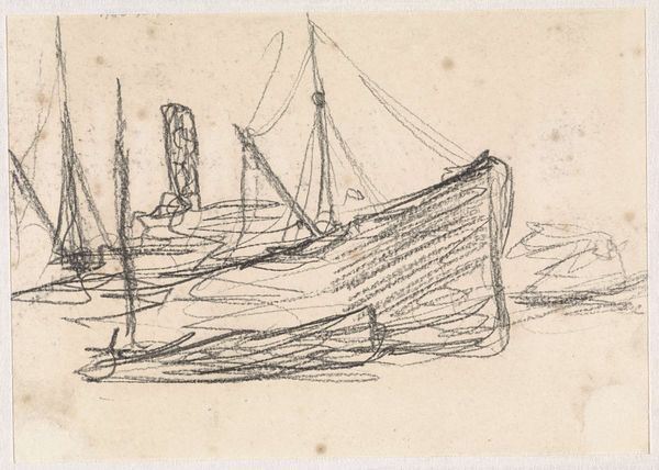 Editor: This is "Boats on the Beach," a pencil drawing by Anton Mauve, made sometime between 1848 and 1888. It’s at the Rijksmuseum. It's such a simple sketch, almost ghostly in its lines. What stands out to you in terms of its construction? Curator: Its formal elements provide significant insight. Note the economical use of line to define form. Mauve masterfully employs a limited tonal range, emphasizing the subtle modulations within the composition. Editor: What does that achieve? Curator: By using a restricted palette and minimal detail, Mauve focuses our attention on the skeletal structure of the scene. Observe the diagonal thrust of the main sailboat's mast, and the implied recession into space created by the overlapping hulls. How do these compositional choices guide your eye? Editor: I see that the diagonal does create movement, making the boats dynamic rather than static. Curator: Precisely. This dynamism is further accentuated by the contrast between the relatively solid form of the primary boat and the more ethereal rendering of the figures and distant vessels. Editor: It's almost like he's exploring the essence of "boatness," not necessarily a specific boat. Curator: Indeed. We see a preoccupation with fundamental forms rather than descriptive detail, a feature that allows the viewer to participate actively in constructing the image. Editor: So, it is the simplicity itself that makes it engaging, not in spite of it? Curator: Exactly. Through this stark visual language, Mauve directs our gaze inward, towards an essential understanding of the scene before us, distilled to its most rudimentary components. Editor: I hadn’t considered how much the simple structure actually does. Thank you for this insight. Curator: My pleasure. The beauty lies in discerning how the formal choices resonate with the thematic intentions of the work.