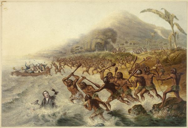 Curator: What strikes me immediately about this oil painting is the overwhelming sense of movement. The figures, the landscape, even the clouds, all seem to be swept up in the dynamism of the game. Editor: This is “Ball Playing among the Sioux Indians,” a work from 1851 by Seth Eastman. Eastman, a West Point graduate, served as a topographical artist, documenting Native American life, and this painting exemplifies his attempts to capture their culture. Curator: Attempts, being the operative word, yes? Because the formal elements are intriguing, but the overall representation feels... romanticized. Look at the idealised musculature of the figures, the classical landscape composition in the background. The artist prioritizes aesthetic beauty over ethnographic accuracy, doesn’t he? Editor: Precisely. Eastman's position in the military shaped his understanding, one might even say "gaze," of Native American activities. His work, exhibited back East, was aimed at depicting them for an eastern audience to foster certain perspectives, influencing popular understanding and governmental policies. Curator: The dramatic sky is doing a lot of work here too, stylistically, with those expressive storm clouds towering over what is seemingly a very innocent game. There’s an implied tension created between this vast landscape and this almost intimate portrayal of a community ritual. Is this meant to elevate, to foreshadow, or perhaps to diminish, through grandiosity? Editor: That's the question isn’t it? Is Eastman attempting to ennoble the Sioux by placing them within this sublime landscape or implicitly comment on their precarious situation within an untamed "America?" The choice of subject, a game, an innocent scene, almost feels strategically deployed to disarm viewers while simultaneously emphasizing the need to incorporate these peoples into an expanding nation. Curator: An interesting paradox. Thank you for giving more depth and broader relevance to my formal reading. Editor: My pleasure; by carefully examining these layers we gain insight into the historical narratives embedded within seemingly straightforward scenes.
