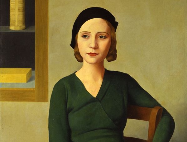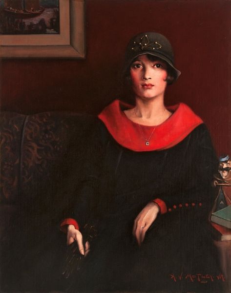 Editor: This is Andre Derain’s "The Cup of Tea," painted in 1935. It's an oil painting currently residing in the Georges Pompidou Center in Paris. There's a striking stillness to the composition. What visual elements strike you most? Curator: The most immediate element is the play of contrasts: light versus shadow, the angularity of the book versus the soft curve of the armchair. The color palette is limited, focused mainly on somber dark tones and bright, almost dissonant, reds in the cushion and the sitter's lips, thereby disrupting the unity. The brushstrokes are clearly visible, adding to a sense of texture, yet somewhat constrained, suggesting a formal, controlled atmosphere. Do you notice how Derain frames the woman's face with her hand? Editor: Yes, the way her hand and gaze meet feels very intentional. It gives a strong sense of psychological introspection, a stark difference with the warmth usually expected of the intimist style. What is the effect of the stark composition? Curator: The formal choices contribute to a sense of distance, an almost theatrical staging. It pushes this intimate scene into a carefully constructed tableau, far from snapshot realism. What does the relationship between the flat planes and perspective suggest to you? Editor: The slightly flattened perspective and sharp angles remind me of cubist influence. It removes any comfortable sense of depth, as though she is existing in two dimensions, while her presence implies she occupies our world. This heightens that strange tension. Curator: Precisely. It underscores the artifice of the work itself. A formal interplay of line, form, and color taking precedence over traditional representation. I was originally convinced that the figure, isolated and framed, alluded to social issues and class divides. The careful analysis of pictorial syntax instead pushes me toward abstraction and structural unity, revealing the painting’s meaning is intrinsic. Editor: That's fascinating! I initially interpreted the painting one way, and now it feels entirely different after analyzing its components with you. Thank you!